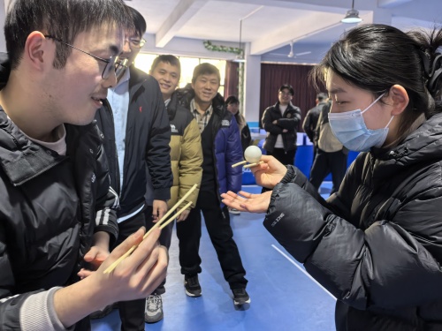 讲解比赛规则后,院办老师率先出战,李国辉、尚肖肖、陈李、张悦文、卞余琴等5人在乒乓球传递中,队员们从夹球传递,到“轨道”传球,在一次次不断摸索中寻找到高效、快速、准确的运球方式,在他们队伍的团结协作下很快通过了第2关、第3关,在阵阵喝彩和加油声中冲向终点!