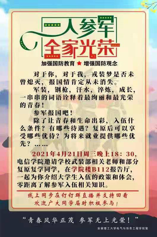 此次活动是学院2021春季征兵宣传活动之一,为解决大学生征兵政策咨询“最后一公里”的问题,学院还通过团委微信公众号、年级钉钉群等线上平台,结合主题班会,线上线下广泛宣传与点对点重点宣传多种方式相结合开展征兵宣传活动,鼓励广大青年学生加入绿色军营。