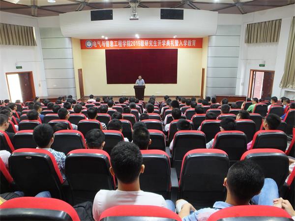 学院院长李敬兆致欢迎词,代表学院2000余名师生向2015级研究生新同学表示衷心的祝贺与诚挚的欢迎,介绍了学校、学院的历史及发展变迁、专业方向和学院当前科研情况,并对2015级硕士研究生提出殷切期望:一是作为一名“研究”生,就是要不断地探求、持之以恒地追求;二是作为研究生,要为学院本科生做好表率、带好头;三是要求研究生要把钻研的精神、学习的态度和思维的方法应用到今后的学习工作中,取得优异的成绩。最后希望全体研究生严格遵守校规校纪,刻苦努力地钻研,度过令人难忘的研究生时代。