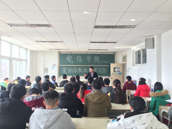 为切实加强大学生思想教育引导工作,认真贯彻落实党的宗教政策,11月30日中午,学院本14级学生党支部在北3057教室开展党的宗教政策学习教育会,22名中共预备党员和50多名发展对象参加学习教育会,会议由支部书记衡连伟主持。