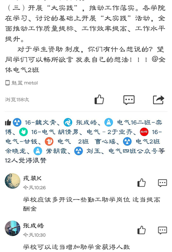 为保证活动顺利开展、取得实效,12月15日,学院专门召开专题会议,统一进行工作布置。随后,围绕“健全学生资助制度,我们要怎么做”“打赢教育脱贫攻坚战,资助工作怎么干”等话题,在全院分学生工作队伍、年级代表、学生骨干、班级等四个层面开展座谈与讨论,同时通过新媒体平台、研讨会、主题实践等形式推进活动深入展开。各年级辅导员深入班级召开专题座谈会,广泛征询各年级同学意见建议,听取推动资助工作发展的对策和措施。学院领导和各年级辅导员还邀请贫困生或对资助工作有困惑的同学进行个别谈心谈话,宣传国家和学校关于精准脱贫、精准资助等一系列相关资助政策,详细说明贫困生认定材料的审核、评选程序和资助监督考评机制,帮助他们答疑解惑,提升学生对学院资助工作的支持率和满意度。活动对学院所有班级和学生全覆盖,在广大青年学生中反响强烈。
