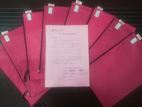 随后,学院领导老师为考研学子送上精心准备的考研礼包:红色的文具袋贴上了每一名同学的姓名及鼓励话语,精心挑选的2B铅笔、橡皮、小刀、套尺、水笔、胶带等解决了考研必需,学院全体领导和毕业班辅导员亲笔签名的祝福信表达了学院对同学们的美好祝愿。