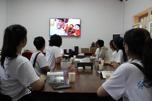 志愿者观看当地发展成就宣传片