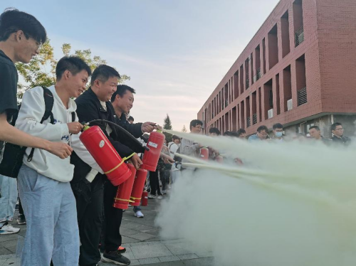 学习使用消防器材,现场体验加深印象。最后,学院联合校保卫处在学院东门附近的空旷地带进行现场灭火演练。彭广峰老师现场讲述灭火要领并示范后,组织8名师生为一组轮流进行灭火演练。