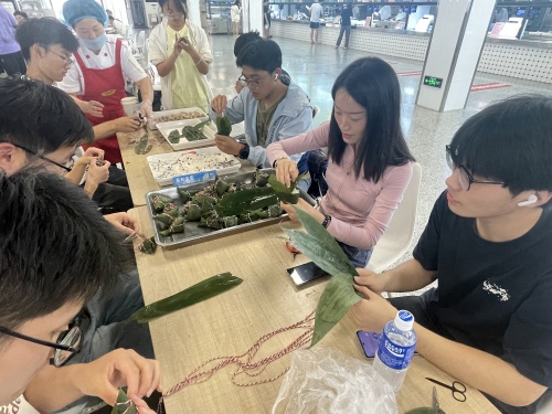 5月25日,学院团委在爱苑食堂二楼举办“粽叶飘香聚温情”端午文化实践活动,120余名师生共同参与。活动中,食堂工作人员现场示范粽叶折叠、糯米填充、棉线捆扎等传统技法,师生分组协作,从粽叶选择到馅料搭配,从包扎技巧到蒸煮窍门,制作出形态各异的粽子,亲身体验手工劳动的细致与乐趣。期间穿插端午节知识问答,围绕历史渊源、民俗文化展开互动,学生在劳动中加深对传统文化的认知。
