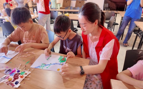 在江村文化服务中心,实践团与南京审计大学志愿者携手,开展“童心绘家乡”美育活动。两地青年引导孩子们用油彩描绘心中家乡,既培养了青少年的乡土情怀,又搭建了校际交流的友谊桥梁,实现了美育实践与校际合作的双赢。