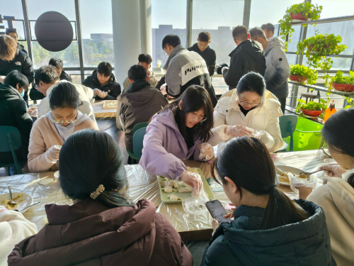 活动现场气氛热烈,同学们自发分组、分工协作。从擀皮、填馅到捏合定型,大家相互交流着不同地域的包饺子手法,形态各异的饺子在欢声笑语中摆满餐盘,既有传统样式,也不乏创意造型,展现了同学们的巧思与默契。包好的饺子由食堂工作人员协助煮熟,热气腾腾的饺子出锅后,师生围坐分享,品尝着自己的劳动成果,现场洋溢着浓厚的节日气氛与集体的温暖。